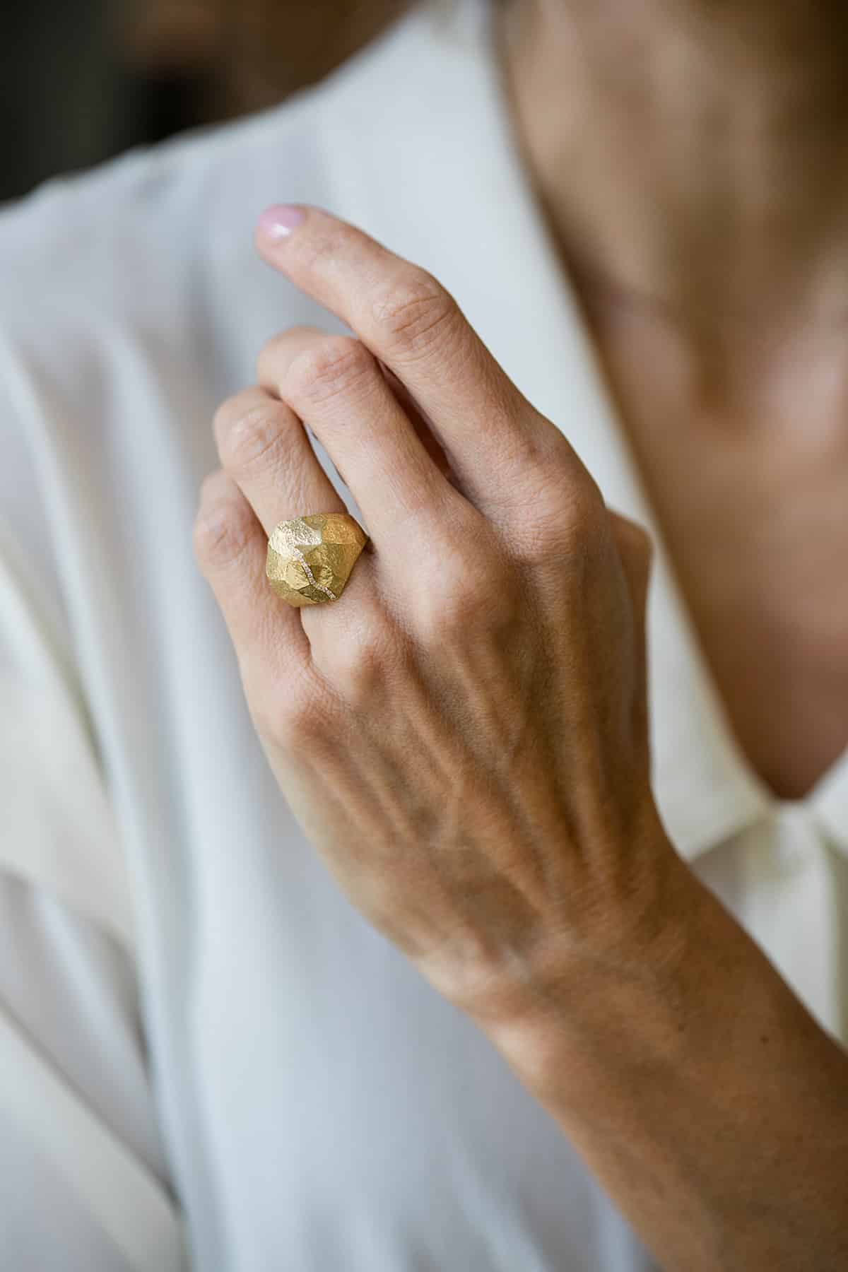 Bague en or jaune 18 carats, sertie de diamants G-VS 0,076ct. Surface facettée et texturée "rock".