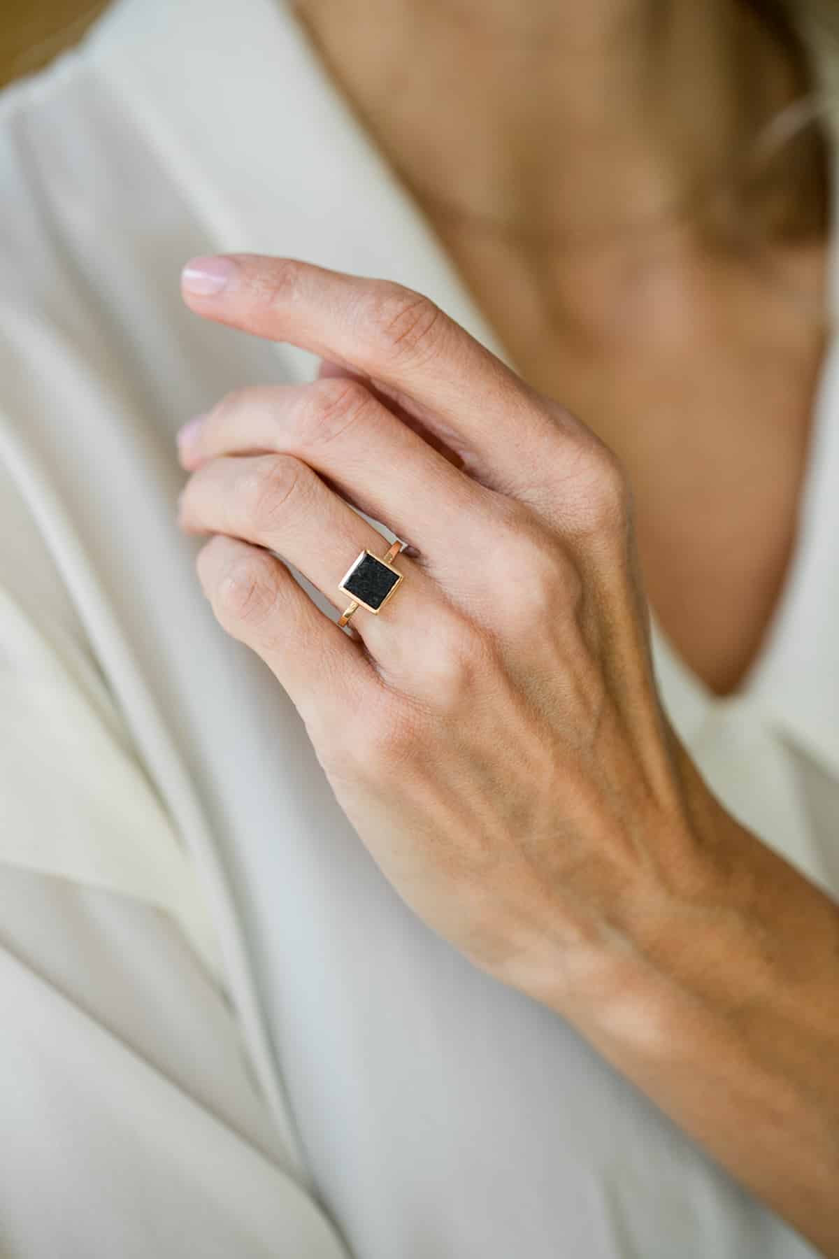 Bague en or rose 18 carats et un pavé de granite noir.