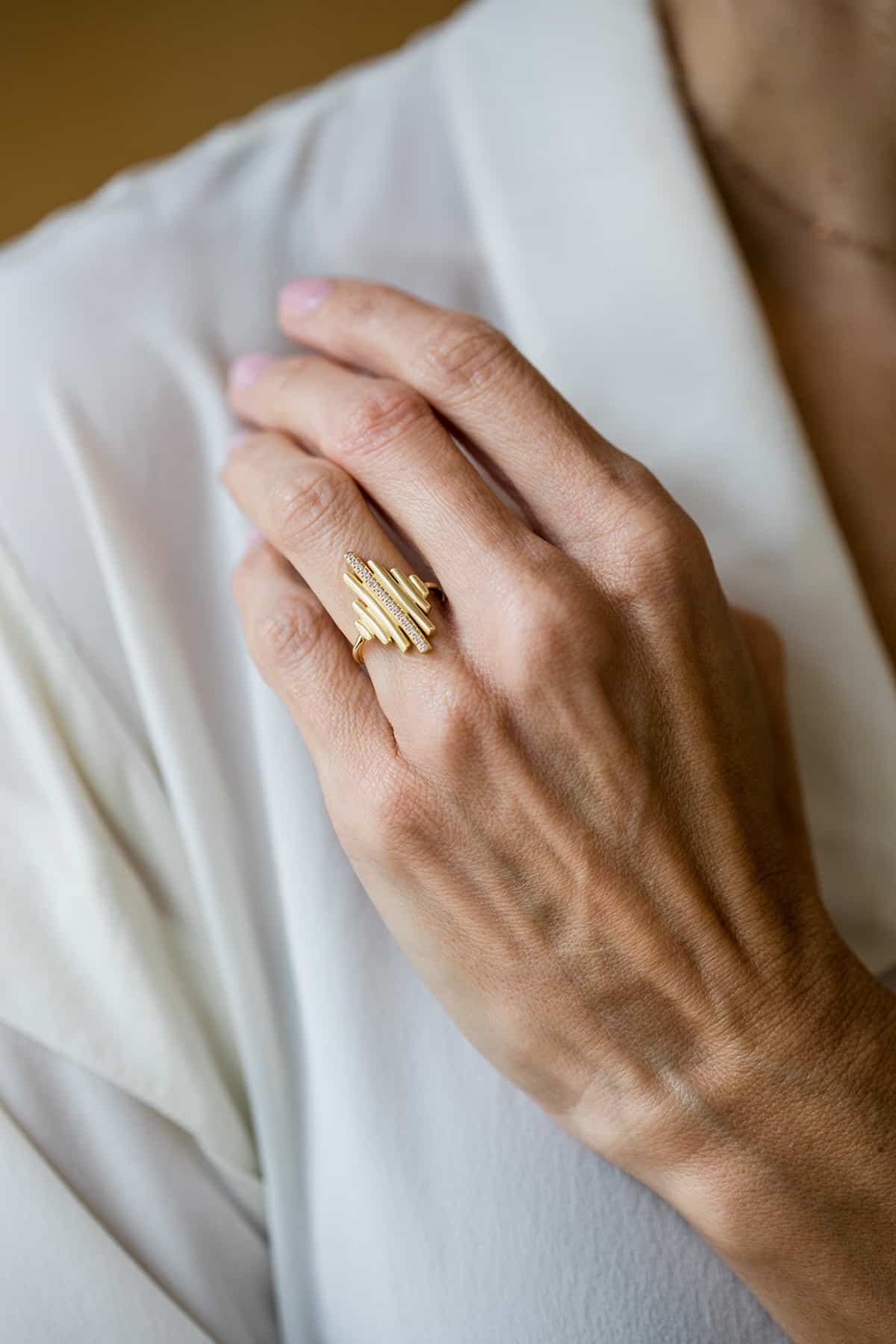 Bague en or jaune 18 carats satiné, sertie d'une ligne de 0.09 ct de diamant G-VS.