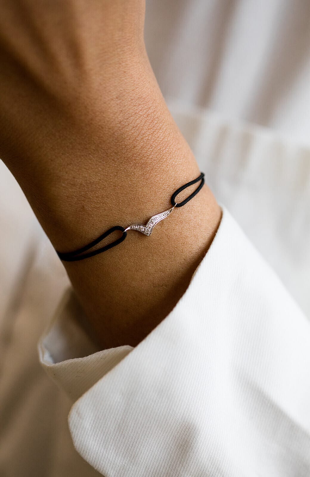 Bracelet en or gris 18 carats, serti de diamants G-VS 0.044 ct. Monté sur fil nylon noir.