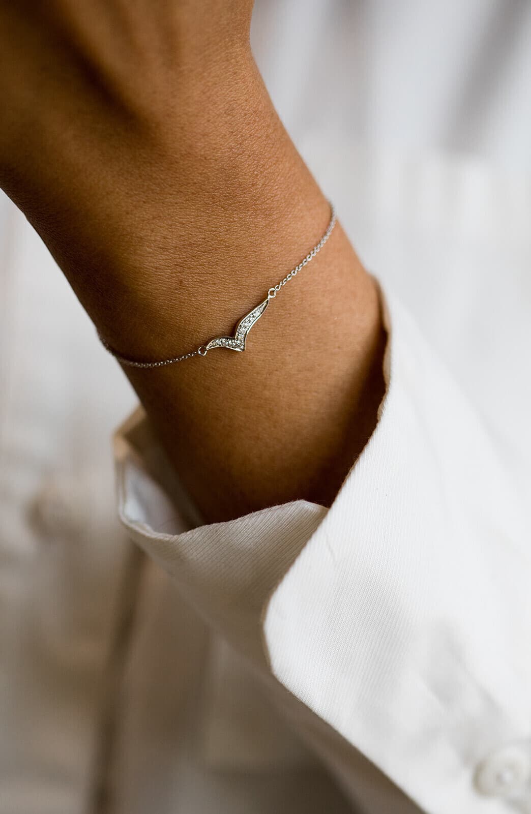 Bracelet « petit » Bird en or gris 18 carats, sur chainette de 16-19cm.. Serti de diamants G-VS 0.06 ct.