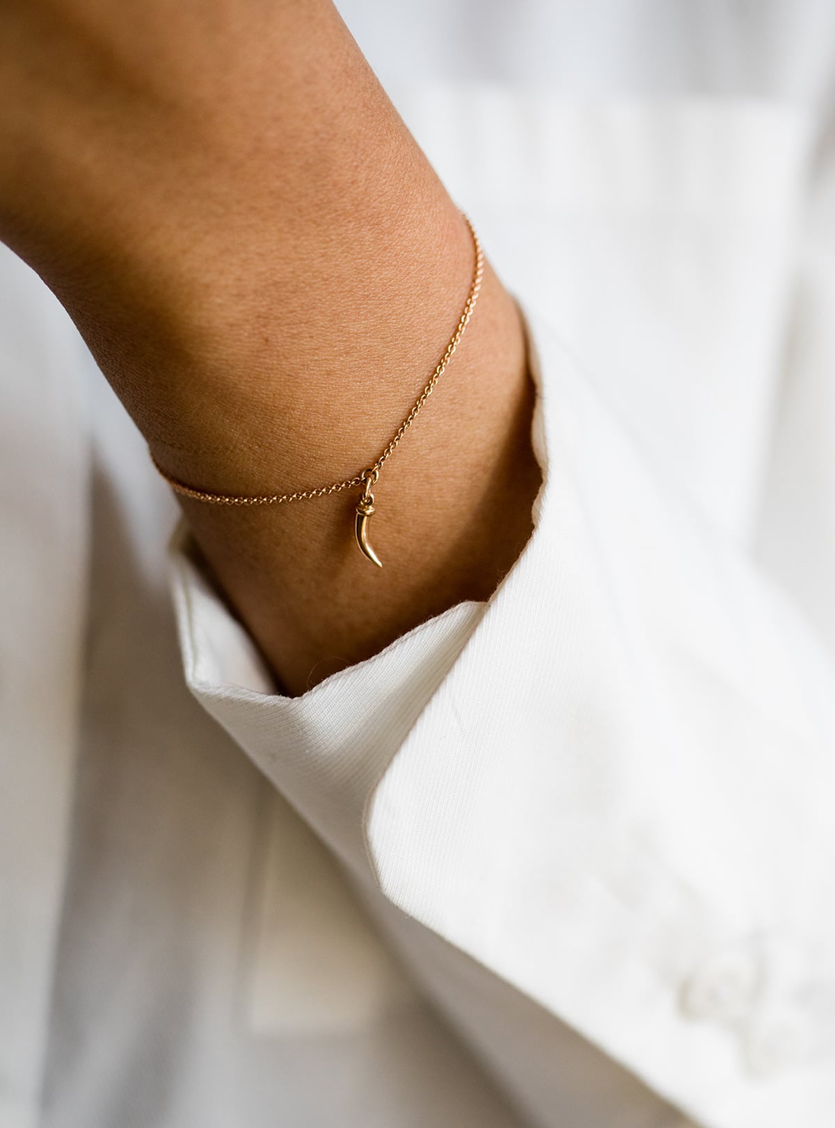 Bracelet en or jaune 18 carat. Petite corne sur chaînette maille forçat. Longueur 17 cm.