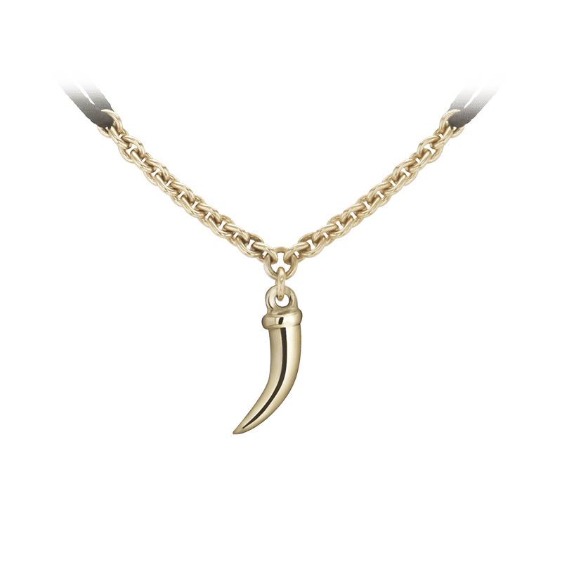 Bracelet en or jaune 18 carat. Petite corne sur chaînette et cordon nylon noir.