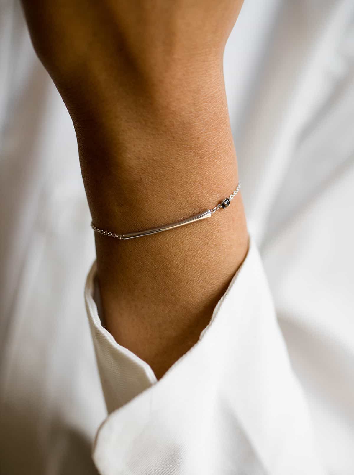 Bracelet en or gris 18 carats satiné, serti d'un diamant 0.11 ct taille rose.