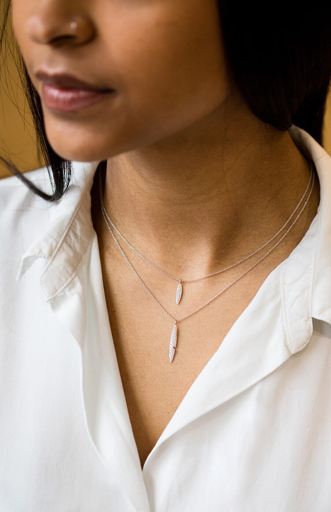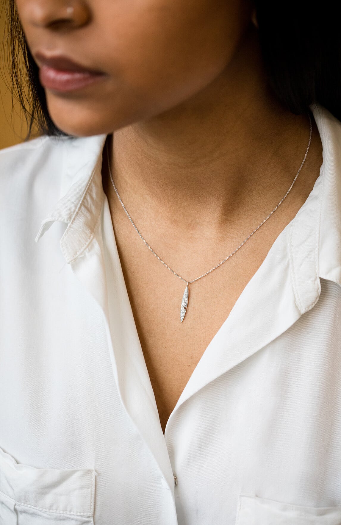 Pendentif Plume sertie en or gris 18 carats, diamants G-VS 0.20ct. Sur chaîne de 45-50 cm.