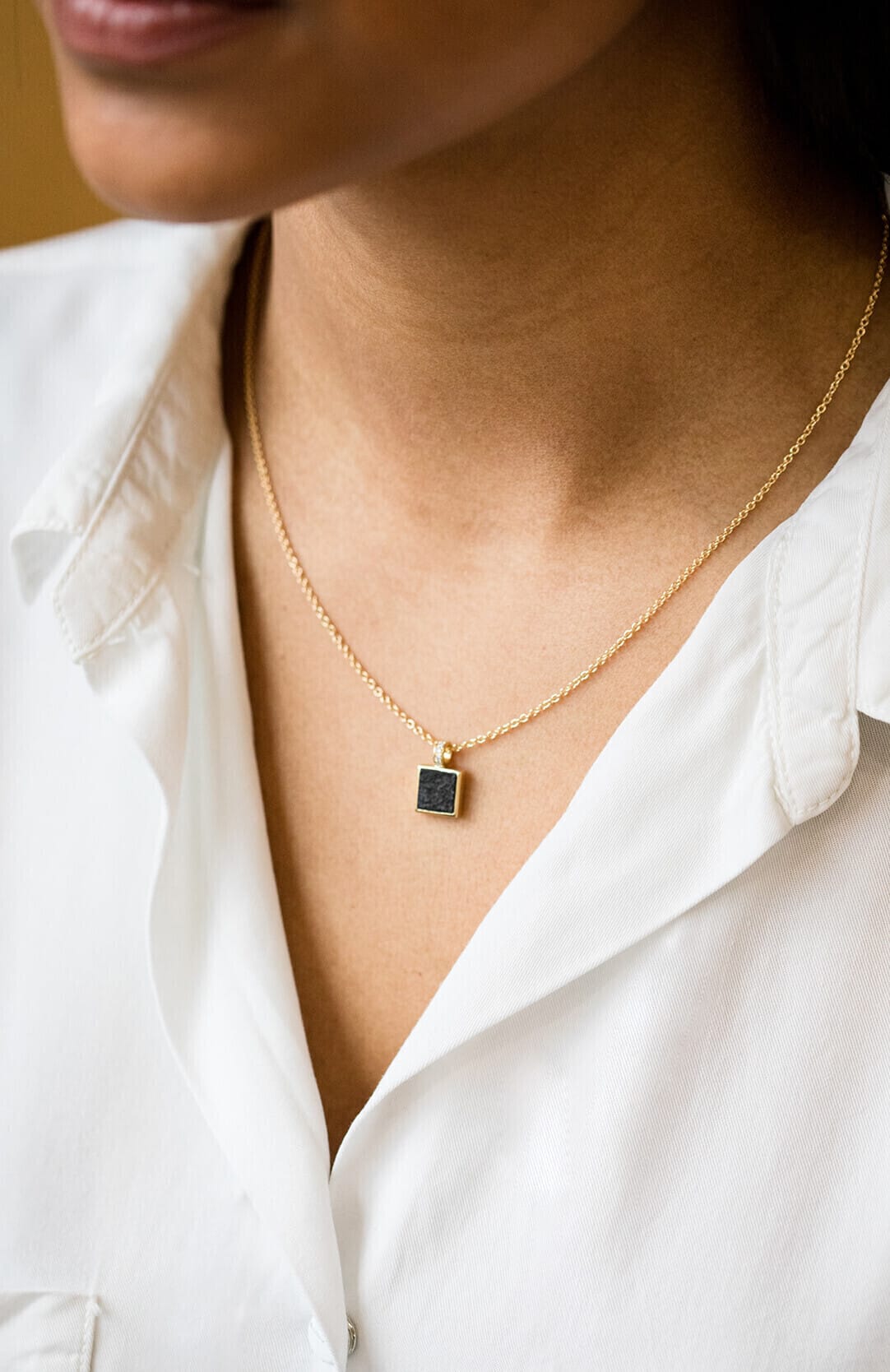 Pendentif en or jaune 18 carats. Pavé en granite noir et bélière sertie de diamants G-VS 0.03ct. Sur chaîne de 42-45 cm.